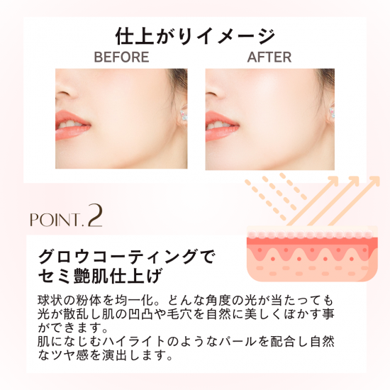 13.8㎛(マイクロメートル)まで細かくなった粒子を1粒単位でグロウコーディング。肌表面の凹凸を均一に整え光をまとったセミ艶肌に仕上げます