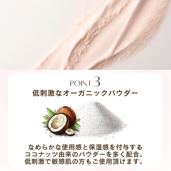 低刺激でなめらかな使用感と保湿感を付与するココナッツ由来のオーガニックパウダーを配合で極上の使い心地