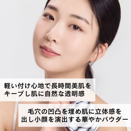 軽いつけ心地で長時間美肌をキープし肌に自然な透明感。毛穴の凹凸を受め肌に立体感を出し小顔を演出する華やかパウダー